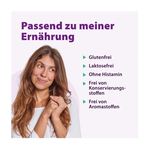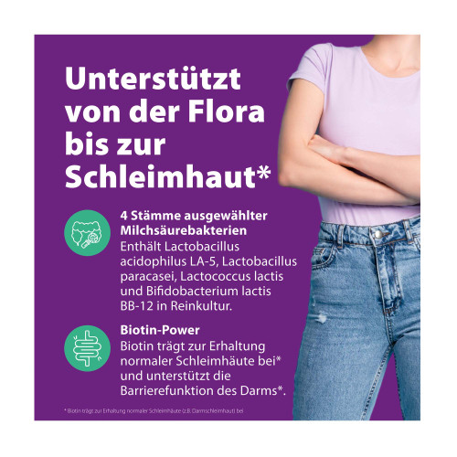 Nahrungsergänzungsmittel mit Biotin und Milchsäure bildenden Bakterien. Biotin trägt zur Erhaltung normaler Schleimhäute (z.B. Darmschleimhaut) bei.