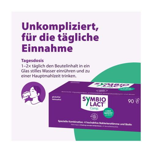 SymbioLact Comp. sollte bei Raumtemperatur gelagert werden. Bitte beachten Sie das Mindesthaltbarkeitsdatum (Monat/Jahr) auf der Packung.