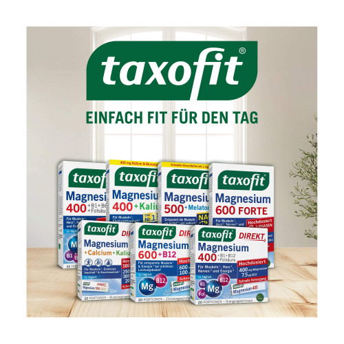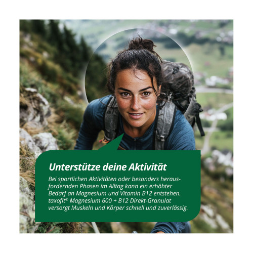 Bei sportlichen Aktivitäten oder besonders herausfordernden Phasen im Alltag kann ein erhöhter Bedarf an Magnesium und Vitamin B12 entstehen. taxofit® Magnesium 600 + B12 Direkt-Granulat enhält hochdosiertes Magnesium, um die Muskeln zu entspannen sowie Vitamin B12, um den Körper mit Energie zu versorgen und Müdikeit zu verringern. Das Direkt-Granulat versorgt Muskeln und Körper schnell und zuverlässig. Zudem ist es praktisch für unterwegs und ohne Wasser einzunehmen.