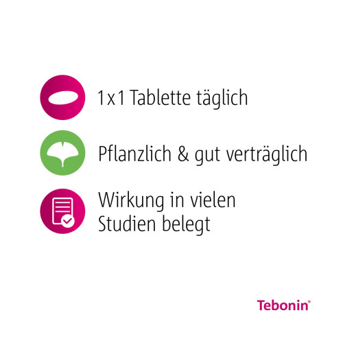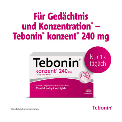 Tebonin® konzent® 240 mg. Wirkstoff: Ginkgo-biloba-Blätter-Trockenextrakt. Anwendungsgebiete: Zur Verbesserung einer altersbedingten Verschlechterung geistiger Fähigkeiten und der Lebensqualität bei leichter Demenz.