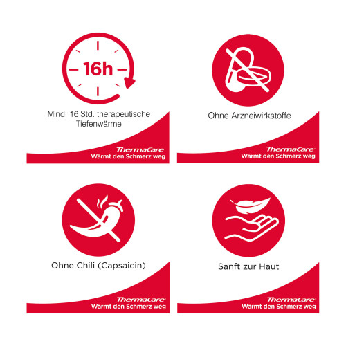 Ihr Risiko für Verbrennungen steigt mit zunehmendem Alter. Wenn Sie 55 Jahre oder älter sind, tragen Sie ThermaCare über dünner Kleidung und nicht während Sie schlafen. Sprechen Sie vor der Anwendung mit Ihrem Arzt/Ihrer Ärztin, wenn Sie an Diabetes, Durchblutungsstörungen, Herzerkrankungen oder rheumatoider Arthritis leiden oder wenn Sie schwanger sind. Beenden Sie die Anwendung und sprechen Sie mit Ihrem Arzt/Ihrer Ärztin, wenn Sie im Anwendungsbereich Beschwerden, Verbrennungen, Schwellungen, Ausschläge oder andere anhaltende Veränderungen Ihrer Haut feststellen, und wenn Ihre Schmerzen länger als 7 Tage anhalten oder sich verschlimmern.