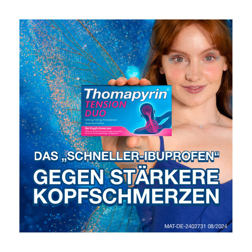 Thomapyrin® Tension Duo 400 mg/100 mg Filmtabletten. Anwendungsgebiete: Für Erwachsene zur kurzzeitigen symptomatischen Behandlung von akuten mäßig starken Schmerzen, wie Zahnschmerzen oder Kopfschmerzen.