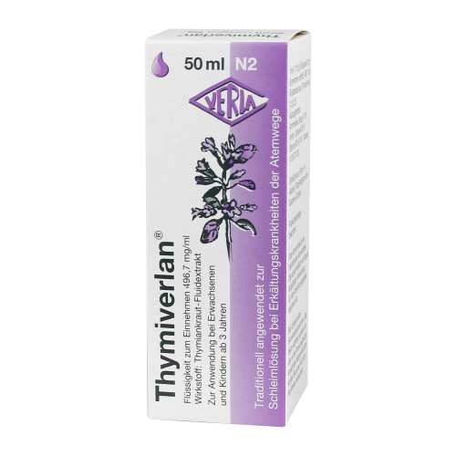 Thymiverlan, Flüssigkeit zum Einnehmen 496,7 mg/ml Wirkstoff: Thymiankraut-Fluidextrakt. Anwendungsgebiete: Traditionelles pflanzliches Arzneimittel zur Anwendung (zur Schleimlösung) bei Erkältungskrankheiten der Atemwege mit produktivem Husten, ausschließlich aufgrund langjähriger Anwendung. Warnhinweis: Enthält bis zu 19 Vol.-% Alkohol, Propylenglycol und Sucrose (Zucker).
