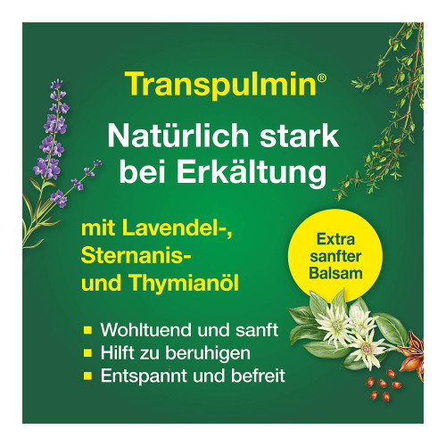 Zur Verbesserung des Befindens können Sie den Transpulmin Baby Balsam verwenden. In seiner Rezeptur vereint er sanfte, speziell auf Babys und Kinder abgestimmte hochwertige ätherischen Öle. Die ausgewogene Mischung aus ätherischen Ölen von Lavendel, Sternanis und Thymian hilft Ihrem Kind dabei zu entspannen und fördert eine ruhige Atmung.