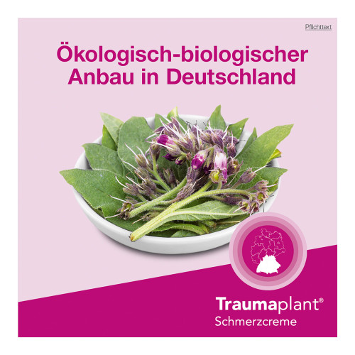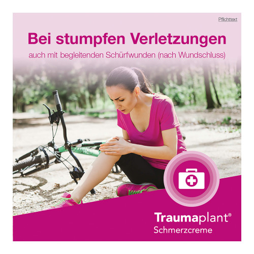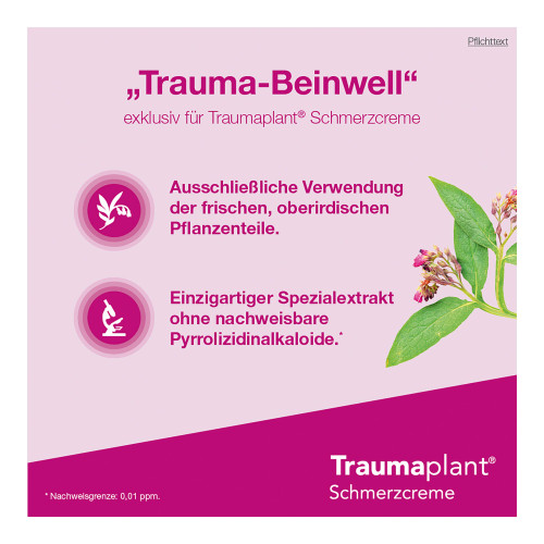 Traumaplant. Wirkstoff: Beinwell-Zubereitung (1 g Beinwell-Zubereitung aus frischem Symphytum x uplandicum-Kraut/10 g Creme). Anwendungsgebiete: Wird angewendet bei Prellungen und Verstauchungen (bei Sport- und Unfallverletzungen), Muskel- und Gelenkschmerzen infolge stumpfer Verletzungen. Warnhinweis: Enthält 13 mg Propylenglycol pro 1 cm Salbenstrang und Sorbinsäure.
