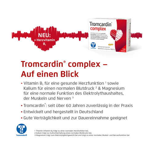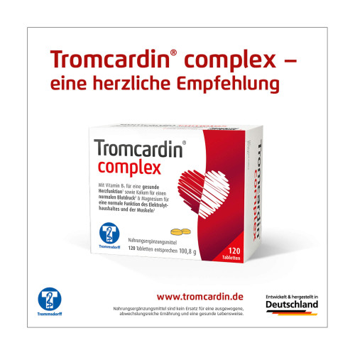Tromcardin® complex ist ein Nahrungsergänzungsmittel und kein Arzneimittel. Es sind keine Nebenwirkungen bekannt. Nahrungsergänzungsmittel dürfen von Gesetzes wegen nur in Verkehr gebracht werden, wenn sie sicher sind. Wie bei allen Nahrungsergänzungsmitteln können jedoch im Einzelfall individuelle Unverträglichkeiten oder allergische Reaktionen (bei Allergie auf einen der enthaltenen Inhaltsstoffe) auftreten.