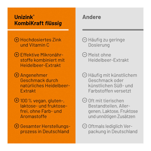 Unizink® KOMBIKRAFT ist glutenfrei, frei von Laktose sowie frei von künstlichen Farb- und Aromastoffen.
