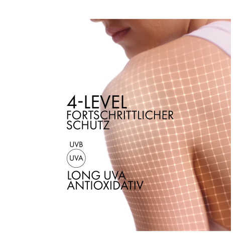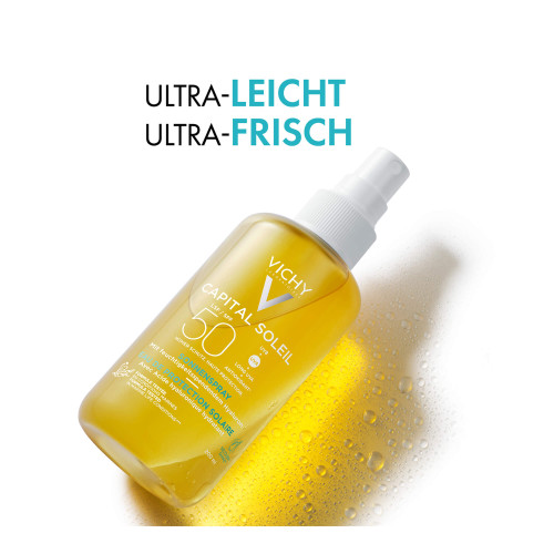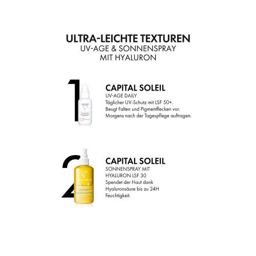 Vichy CAPITAL SOLEIL Sonnenspray mit Hyaluron LSF 30 ist eine Sonnenpflege, die dank fortschrittlicher UV-Schutz-Technologie die Haut optimal vor UVA-, UVB- sowie langen UVA-Strahlen schützt und gleichzeitig antioxidativ wirkt. So kann Sonnenschäden auf Zellebene effektiv entgegengewirkt werden. Zusätzlich versorgt das Sonnenspray die Haut dank Hyaluronsäure bis zu 24 Stunden lang intensiv mit Feuchtigkeit und schützt so vor dem Austrocknen der strapazierten Haut. Das CAPITAL SOLEIL Sonnenspray mit Hyaluron LSF 30 von Vichy ist frei von Octocrylen, Homosalat, Mikroplastik und EDTA, und wurde unter Berücksichtigung des Meereslebens entwickelt.
