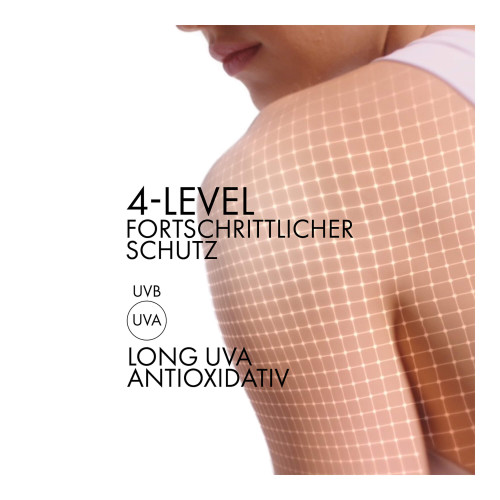 Unter dermatologischer Aufsicht an empfindlicher Haut getestet. Die Haut wird von Sonnenbrand und Photoalterung geschützt.
