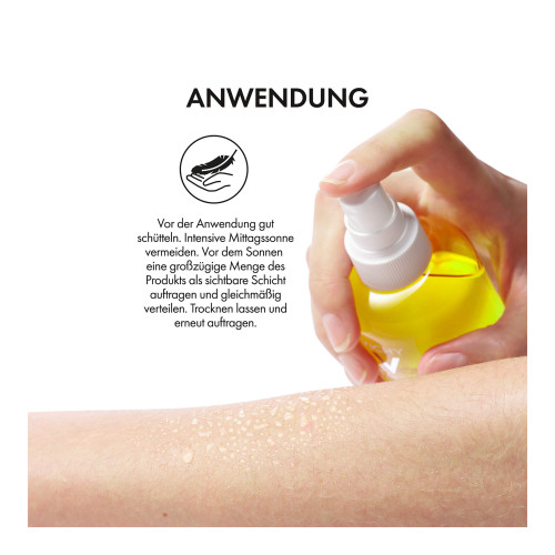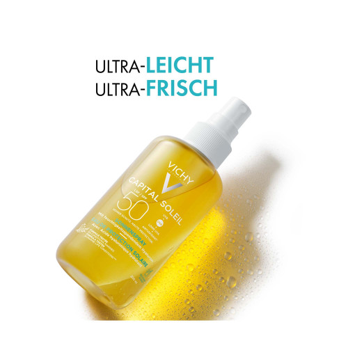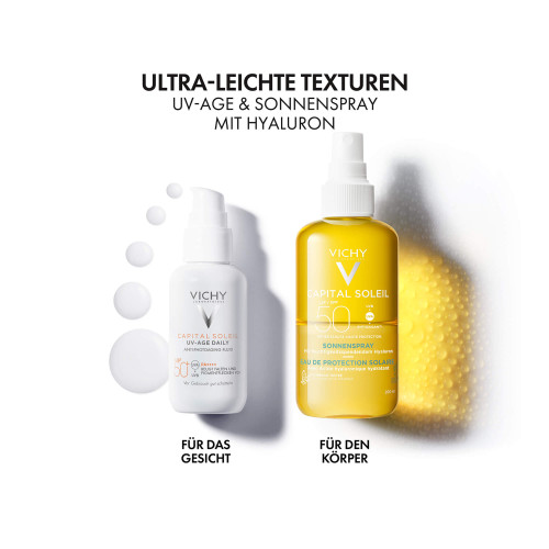 Vichy CAPITAL SOLEIL Sonnenspray mit Hyaluron LSF 50 ist eine Sonnenpflege, die dank fortschrittlicher UV-Schutz-Technologie die Haut optimal vor UVA-, UVB- sowie langen UVA-Strahlen schützt und gleichzeitig antioxidativ wirkt. So kann Sonnenschäden auf Zellebene effektiv entgegengewirkt werden. Zusätzlich versorgt das Sonnenspray die Haut dank Hyaluronsäure bis zu 24 Stunden lang intensiv mit Feuchtigkeit und schützt so vor dem Austrocknen der strapazierten Haut. Das CAPITAL SOLEIL Sonnenspray mit Hyaluron LSF 50 von Vichy ist frei von Octocrylen, Homosalat, Mikroplastik und EDTA, und wurde unter Berücksichtigung des Meereslebens entwickelt.