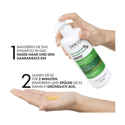 Tragen Sie das Vichy DERCOS Anti-Schuppen Shampoo für trockenes Haar auf die nasse Kopfhaut auf, massieren Sie es mit sanften Bewegungen ein und lassen Sie es bei der ersten Anwendung zwei Minuten einwirken. Danach gründlich ausspülen.