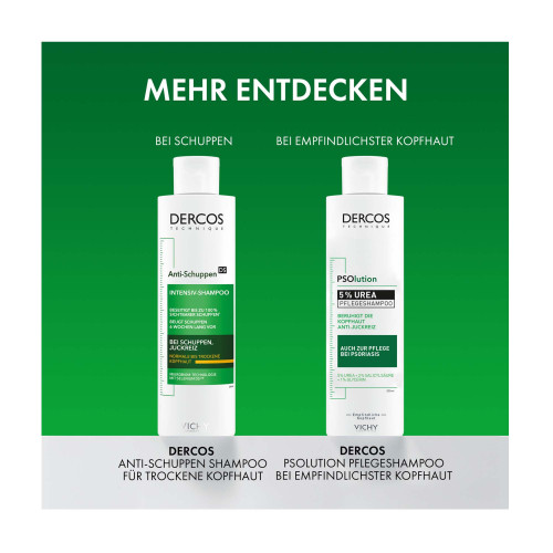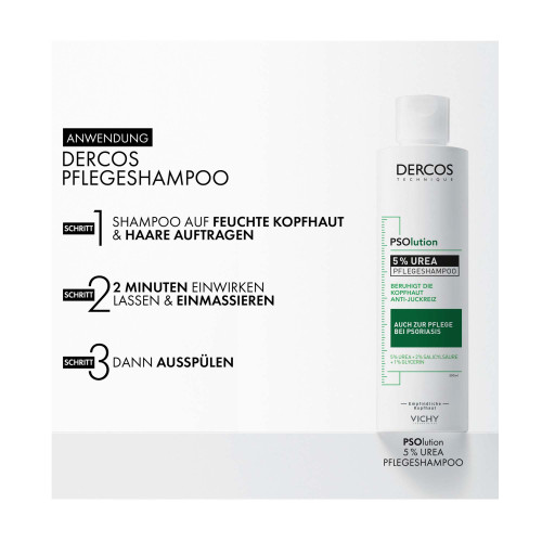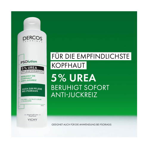 Das DERCOS PSOlution Shampoo gegen Schuppenflechte eignet sich insbesondere für empfindliche Kopfhaut. Zudem bietet sich die schonende Pflegeformel bei medizinischen Behandlungen als optimale Ergänzung an. Mit dem Shampoo von Vichy wird die Kopfhaut dank enthaltener Salicylsäure sanft gepeelt, Urea entfernt Rückstände effektiv und Glycerin versorgt die Kopfhaut intensiv mit Feuchtigkeit. Das kerato-reduzierende Pflegeshampoo wirkt den Anzeichen von Juckreiz und Kribbeln gezielt entgegen – so wird die natürliche Abschuppung gefördert, die Kopfhaut beruhigt und die Haare fühlen sich deutlich weicher an.