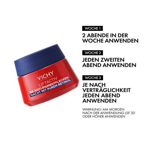 Reinigen Sie das Gesicht jeden Abend gründlich. Da es sich um eine Gesichtscreme mit Retinol handelt, tragen Sie die LIFTACTIV B3 Retinol Anti-Pigmentflecken Nachtcreme in der ersten Woche an zwei Abenden pro Woche auf. In der zweiten Woche wenden Sie die Gesichtspflege an jedem zweiten Abend an. Je nach Verträglichkeit, nehmen Sie die Creme gegen Pigmentflecken ab der dritten Anwendungswoche in Ihre tägliche Pflegeroutine mit auf. Die Creme mit Retinol steigert die Lichtempfindlichkeit der Haut. Verwenden Sie deshalb am Morgen nach der Anwendung ein Pflegeprodukt mit Lichtschutzfaktor wie die LIFTACTIV B3 Anti-Pigmentflecken Creme LSF 50 (PZN 18092497), um die Haut optimal vor UV-Strahlen zu schützen.
