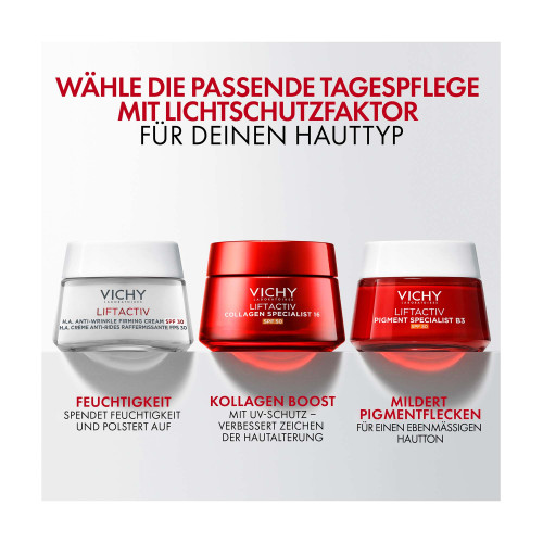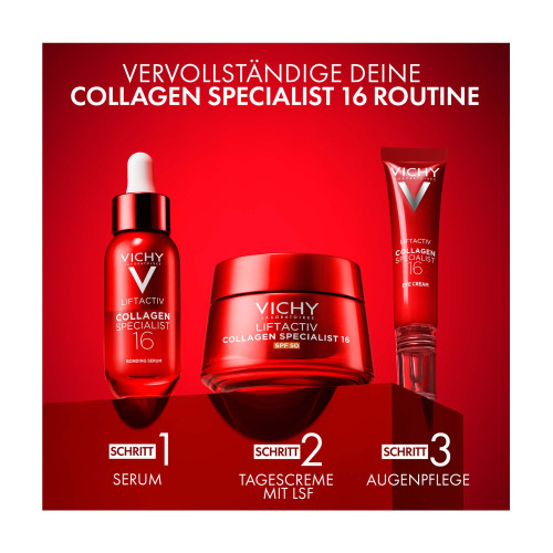 Die Vichy LIFTACTIV Collagen Specialist 16 Creme LSF 50 ist eine Anti-Aging-Pflege, die dank C16 Co-Bonding-Technologie 16 Zeichen der Hautalterung verbessert und dabei die folgenden Effekte auf die Haut hat: Straffheit, Aufpolsterung, Volumenverlust, geglättete Haut, verfeinerte Textur, definierte Konturen, gefestigte Haut, Stärkung der Hautbarriere, Zellerneuerung, Ausstrahlung, Geschmeidigkeit, Elastizität, Feuchtigkeit und Ebenmäßigkeit. Zusätzlich schützt die Tagescreme mit LSF effektiv gegen UV-Strahlung. Die Formel mit schnell einziehender und nicht klebender Textur und dem Wirkstoffkomplex aus Rhamnose, Kollagen-Peptiden und Maitake versorgt die Haut dabei intensiv mit Feuchtigkeit.
