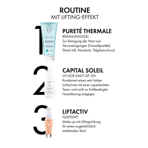 Das Anti-Falten-Make-Up mit straffender Silikon-Textur sorgt für einen sofortigen Lifting-Effekt und einen strahlenden Teint – ohne unerwünschten Masken-Effekt. Dank ihrer elastischen Eigenschaften mildert die straffende Silikon-Textur Falten und passt sich der natürlichen Mimik Ihres Gesichts an. Unebenheiten werden geglättet, der Teint wirkt ebenmäßig und strahlend – den ganzen Tag. Die mit Collagyl angereicherte Pflegeformel enthält drei hocheffiziente Anti-Falten-Wirkstoffe von Vichy. Es wirkt allen Ursachen vorzeitiger Hautalterung entgegen und hilft, Falten schon nach einem Monat zu mildern.