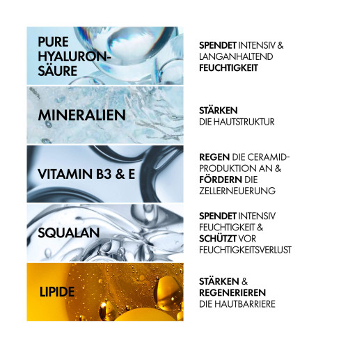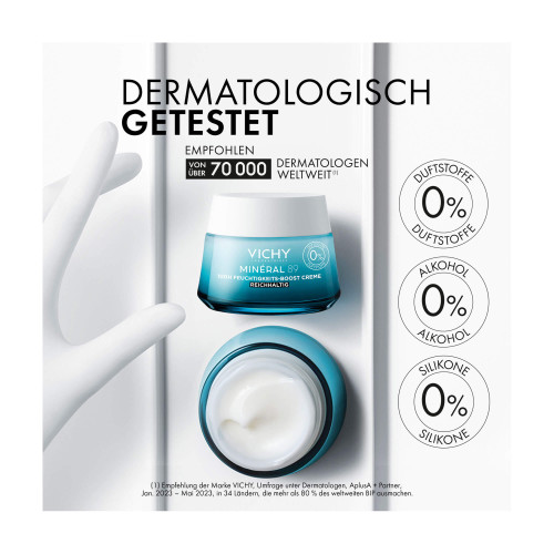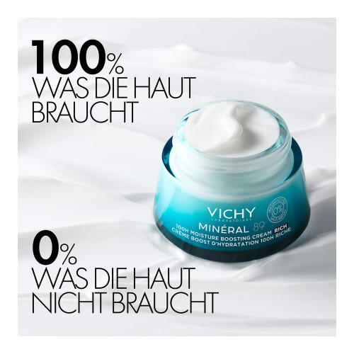 Vichy MINÉRAL 89 Creme ist die optimale Ergänzung zum beliebten MINÉRAL 89 Hyaluron-Booster. Der innovative Wirkstoffkomplex aus Mineralien, langkettiger Hyaluronsäure, Niacinamid (B3) sowie Squalan und Lipiden spendet trockener Haut einen sofortigen Feuchtigkeits-Boost. Die Creme wirkt wie eine zweite Haut, die die Hautschutzbarriere stärkt und regeneriert. Die Feuchtigkeitscreme für das Gesicht Vichy MINÉRAL 89 Creme setzt auf eine minimalistische Formel, die ohne Duftstoffe, Alkohol und Silikone auskommt. So eignet sich die feuchtigkeitsspendende Gesichtscreme insbesondere für empfindliche Haut.