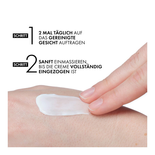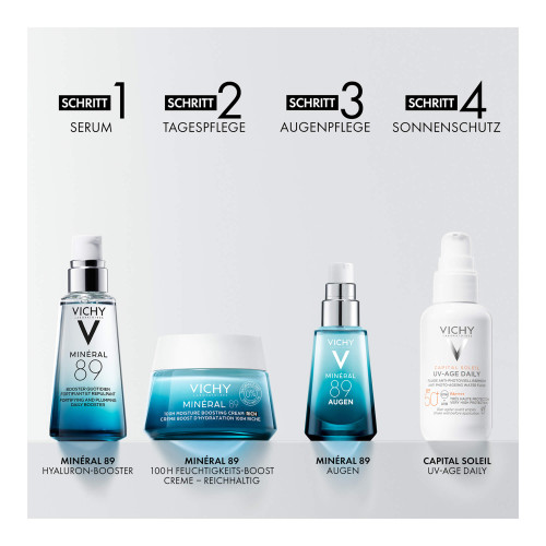 Die feuchtigkeitsspendende MINÉRAL 89 Creme von Vichy täglich morgens und abends als letzten Schritt der täglichen Pflegeroutine anwenden. Dafür die Feuchtigkeitscreme auf das gereinigte Gesicht sowie auf Hals und Dekolleté auftragen und mit den Fingerspitzen vorsichtig einmassieren. Die samtig-weiche, reichhaltige Textur zieht schnell ein und hinterlässt ein intensiv-gepflegtes Hautgefühl. In Kombination mit der Anwendung des MINÉRAL 89 Hyaluron-Boost von Vichy wirkt die MINÉRAL 89 Creme noch effektiver, sodass die Haut optimal mit wertvoller Feuchtigkeit versorgt wird.