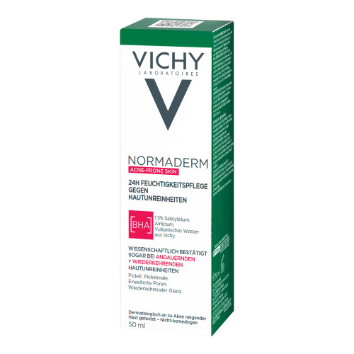 Vichy Normaderm Verschönernde Feuchtigkeitspflege gegen Hautunreinheiten Die mattierende Vichy Normaderm Gesichtspflege für unreine Haut versorgt fettige, zu Akne neigende Haut für bis zu 24 Stunden mit intensiver Feuchtigkeit. Zudem wirken hochwirksame Aktivstoffe, wie Air Licium und Phe-Resorcinol, vergrößerten Poren, Mitessern und Pickelmalen entgegen. Gesichtspflege für trockene, unreine Haut und Pickel Bereits ab der ersten Anwendung hinterlässt die Feuchtigkeitspflege für fettige Haut ein sichtbar verfeinertes und mattiertes Hautbild. Die dermatologisch getestete Formel ist nicht komedogen und enthält beruhigendes Vulkanwasser aus Vichy – auch für empfindliche Haut geeignet.