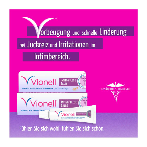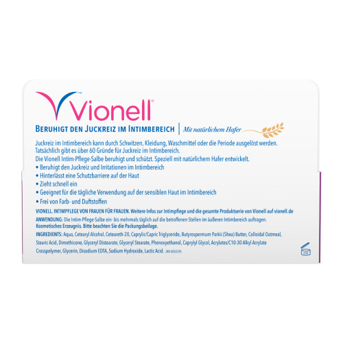 Die Vionell Intim-Pflege-Salbe ist speziell für Frauen entwickelt worden, die unter empfindlicher Haut und Irritationen im Intimbereich leiden. Diese Beschwerden können durch verschiedene Faktoren entstehen, wie etwa Rasur, enge Kleidung, Reibung oder hormonelle Schwankungen. Die Haut im äußeren Intimbereich kann schnell gereizt sein, sich trocken anfühlen, jucken oder brennen. Hier bietet die Vionell Intim-Pflege-Salbe mit natürlichem Hafer schnelle Linderung und intensive Pflege.