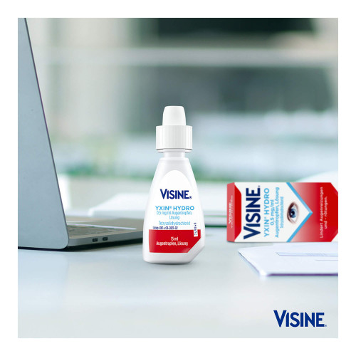 Visine® Yxin® Hydro 0,5 mg/ml Augentropfen. Wirkstoff: Tetryzolinhydrochlorid. Anwendungsgebiete: Zur vorübergehenden Schleimhautabschwellung bei nicht-infektiös bedingten Augenreizungen, z. B. durch Rauch, Staub, Wind, gechlortes Wasser, Licht oder bei Allergien, wie z. B. Heuschnupfen mit Augenbeteiligung, bei Erwachsenen, Jugendlichen und Kindern ab 6 Jahren. Kinder ab 2 Jahren und unter 6 Jahren sollten nur nach Rücksprache mit einem Arzt behandelt werden. Warnhinweis: Enthält Phosphate.