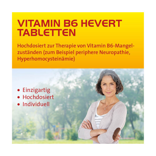 - Behandlung einer peripheren Neuropathie infolge eines durch Arzneimitteleinnahme verursachten Vitamin B6-Mangels: Die Dosierung ist individuell durch den behandelnden Arzt festzulegen. In der Regel werden 50 mg bis 300 mg Pyridoxinhydrochlorid (Vitamin B6) pro Tag empfohlen. (1 Tablette Vitamin B6 Hevert Tabletten enthält 100 mg Pyridoxinhydrochlorid.)