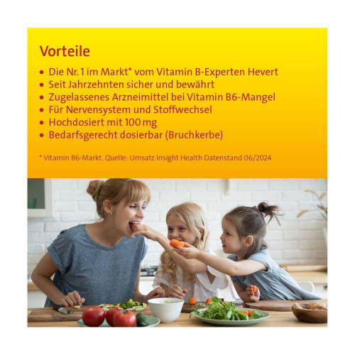 - Erhaltungstherapie nach Vitamin B6-Mangel bedingten Krämpfen bei Neugeborenen und Säuglingen: Die Dosierung ist individuell durch den behandelnden Arzt festzulegen. In der Regel werden Dosierungen von 2 mg bis 200 mg Pyridoxinhydrochlorid (Vitamin B6) pro Tag empfohlen. Der Bedarf steigt abhängig vom Alter und eventuellen weiteren Erkrankungen. (1 Tablette Vitamin B6 Hevert Tabletten enthält 100 mg Pyridoxinhydrochlorid.)