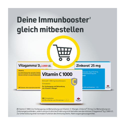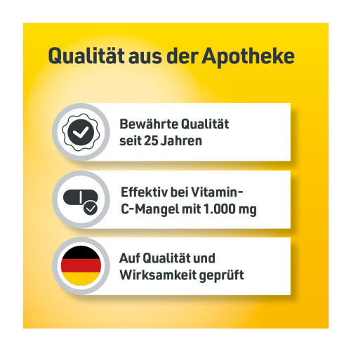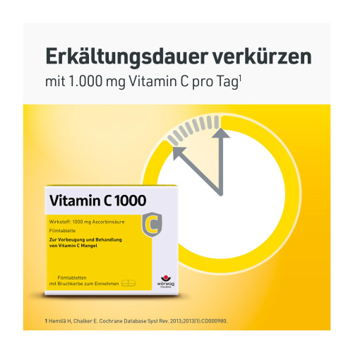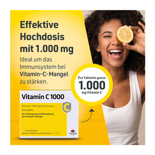 Vitamin C 1000 Filmtabletten. Wirkstoff: Ascorbinsäure 1000 mg. Anwendungsgebiete: Zur Vorbeugung eines Vitamin-C-Mangels, wenn die ausreichende Zufuhr durch die Ernährung nicht gesichert ist. Zur Behandlung von Vitamin-C-Mangel-Krankheiten.