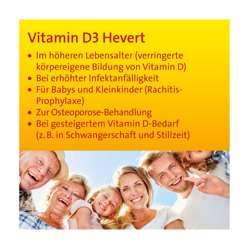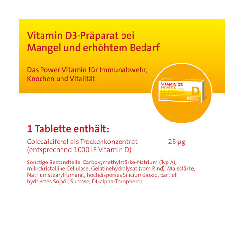 Vitamin D3-Hevert Tabletten. Wirkstoff: Colecalciferol. Anwendungsgebiete: Zur Vorbeugung bei erkennbarem Risiko einer Vitamin D-Mangelerkrankung bei ansonsten Gesunden ohne Resorptionsstörung. Zur unterstützenden Behandlung der Osteoporose. Zur Vorbeugung gegen Rachitis, auch bei Frühgeborenen. Warnhinweis: Enthält Sucrose.