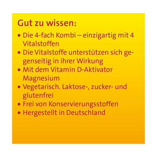 Vitamin D hält das Immunsystem in Schwung, unterstützt die Erhaltung normaler Knochen und die normale Funktion der Muskeln. Vitamin D ist außerdem wichtig für die Zellteilung, die Aufnahme und Verwertung von Calcium und Phosphor und damit für einen normalen Calciumspiegel im Blut. Das in Vitamin D3 K2 Hevert plus Calcium und Magnesium enthaltene mikroverkapselte Vitamin D3 ist eine Form von Vitamin D, die in winzige Kapseln eingeschlossen ist, um seine Stabilität zu verbessern und somit die bestmögliche Wirksamkeit zu erhalten. Diese Kapseln bestehen aus einer Hülle, die das Vitamin D3 umschließt und vor äußeren Einflüssen wie Licht, Sauerstoff und Feuchtigkeit schützt.