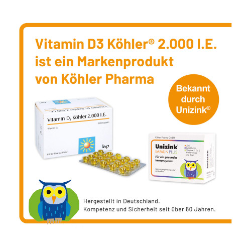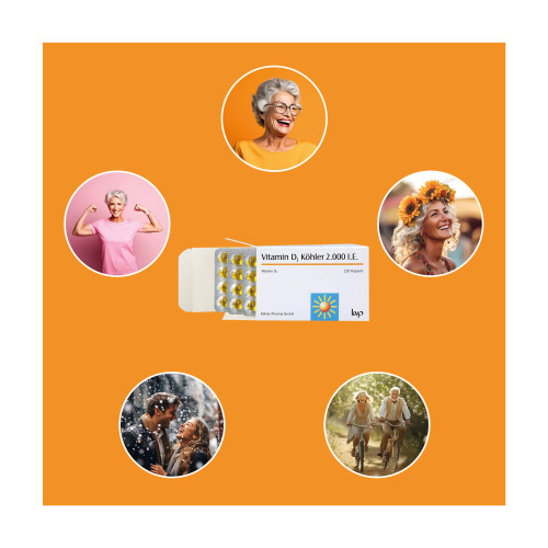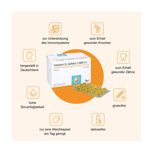 Vitamin D3 Köhler® 2.000 I.E. ist glutenfrei, frei von Fruktose, Hefe, Laktose und Farbstoffen sowie laut Gesetz frei von Konservierungsstoffen.