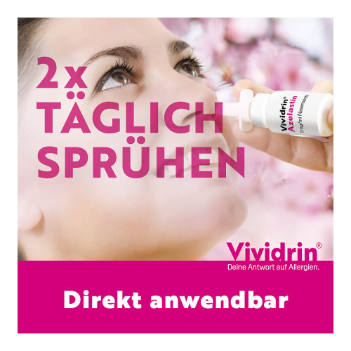 Vividrin® Azelastin 1 mg/ml Nasenspray, Lösung. Wirkstoff: Azelastinhydrochlorid. Anwendungsgebiete: Zur symptomatischen Behandlung von Heuschnupfen (saisonaler allergischer Rhinitis) und bei akuten Schüben (Exazerbationen) ganzjähriger allergischer Rhinitis bei Erwachsenen, Jugendlichen und Kindern ab 6 Jahren. Warnhinweise: Arzneimittel für Kinder unzugänglich aufbewahren.