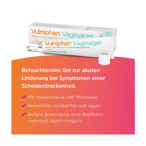 Vulniphan® Vaginalgel bildet auf den betroffenen trockenen Stellen einen schützenden Film und sorgt mit wasserbindenden Substanzen (z. B. Hyaluronsäure) für eine anhaltende Befeuchtung. Durch einen Zusatz von Milchsäure unterstützt das Gel zusätzlich die Aufrechterhaltung des natürlich sauren pH-Wertes in der Scheide und trägt so zum Schutz der Scheidenflora bei.
