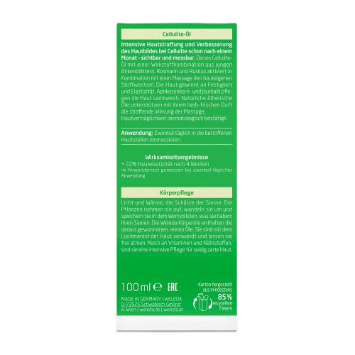 Bringen Sie sich in Form mit dem Weleda Birke Cellulite-Öl. Die Wirkstoffkombination aus jungen, von Hand gepflückten Birkenblättern, sowie Rosmarin und Ruskus aktiviert in Kombination mit einer Massage den hauteigenen Stoffwechsel. Die Haut gewinnt an Festigkeit und Elaszitität. Hochwertiges Aprikosenkern- und Jojobaöl pflegen die Haut samtweich. Dermatologische Tests bestätigen die Wirksamkeit des Birken-Cellulite-Öls.