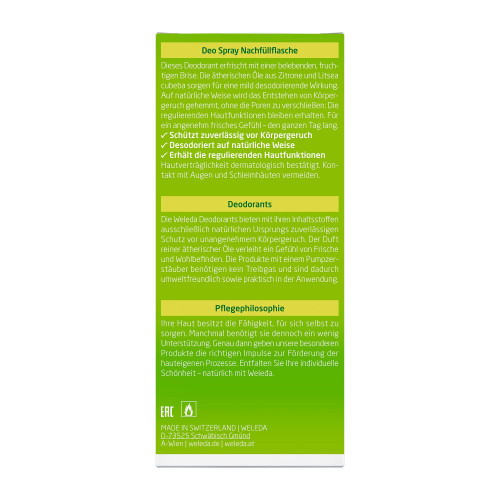 Das Citrus Fresh Deo Spray umgibt Sie mit einer belebenden Brise fruchtiger Zitronenfrische – ohne die Poren zu verschließen. Ätherische Öle aus den Schalen von Citrusfrüchten wirken mild desodorierend, ohne die natürlichen Hautfunktionen zu beeinflussen. Das bedeutet, dass die natürlichen Ausscheidungsprozesse über die Haut, die für einen gesunden Gesamtorganismus notwendig sind, nicht unterbunden und die Poren nicht verschlossen werden. Wirksamkeit und Hautverträglichkeit sind dermatologisch getestet. Ohne Aluminiumsalze.