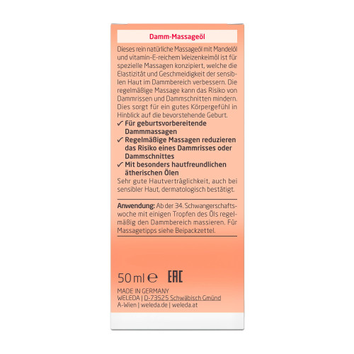 Das Weleda Damm-Massageöl ist eine milde, zu 100% natürliche Mischung auf Basis von sanftem, glättendem Mandelöl. In Verbindung mit Bio-Sesam- und Bio-Jojobaöl sowie Vitamin-E-reichem Weizenkeimöl ist die Formel ideal für Massagen zur Lockerung und Entspannung des Dammbereichs. Der zarte, florale Duft von Muskatellersalbei, Geranium und Rose schenkt Kraft und Zuversicht.