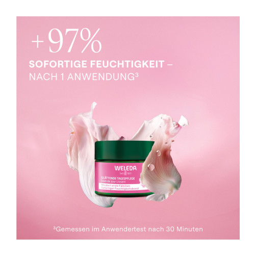 Die Weleda Glättende Tagespflege mindert erste Fältchen, versorgt die Haut mit sofortiger Feuchtigkeit und stärkt ihre Barriere. Der Age-Protect-Complex mit Bio-Wildrosenöl und antioxidativem Weißem Tee schützt wirksam vor den ersten Anzeichen der Hautalterung.