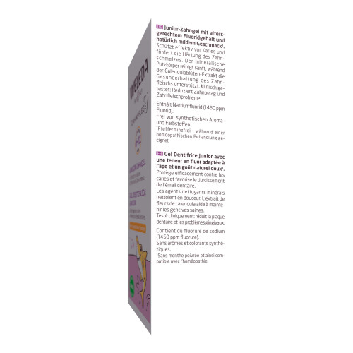 Das Junior-Zahngel mit Fluorid hat Weleda speziell für die Zahnpflege bei Kindern ab 6 Jahren entwickelt. Sie mögen den angenehmen Geschmack der natürlichen ätherischen Öle. Der mineralische Putzkörper reinigt die Zähne sanft aber gründlich, während der Extrakt aus Calendulablüten das Zahnfleisch unterstützt, gesund zu bleiben. Das Zahngel enthält keine Pfefferminze und ist deshalb auch während einer homöopathischen Behandlung geeignet.