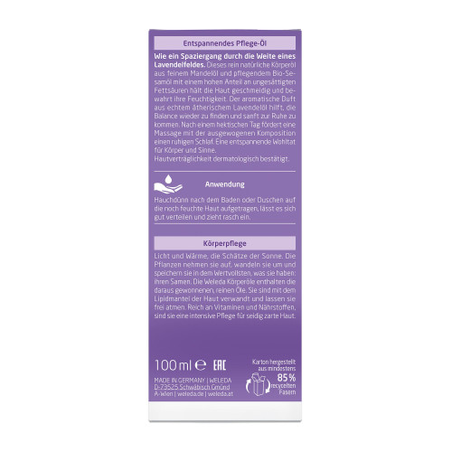 Das Weleda Lavendel Entspannungs-Öl verströmt den Duft und die Wärme der Provence, wirkt angenehm lösend auf Körper und Geist und fördert einen ruhigen Schlaf. Die ausgewogene Komposition aus feinem Mandelöl und leichtem Sesamöl mit einem hohen Anteil an ungesättigten Fettsäuren hält die Haut weich und geschmeidig. Die natürlichen ätherischen Öle sind das Wertvollste des in Licht und Wärme gewachsenen Lavendels. Nach einem warmen, einhüllenden Bad mit dem Weleda Lavendel Entspannungsbad ist eine sanfte Massage mit dem Lavendel Entspannungs-Öl ein Genuss und schenkt kostbare Augenblicke der Entspannung und Harmonie.