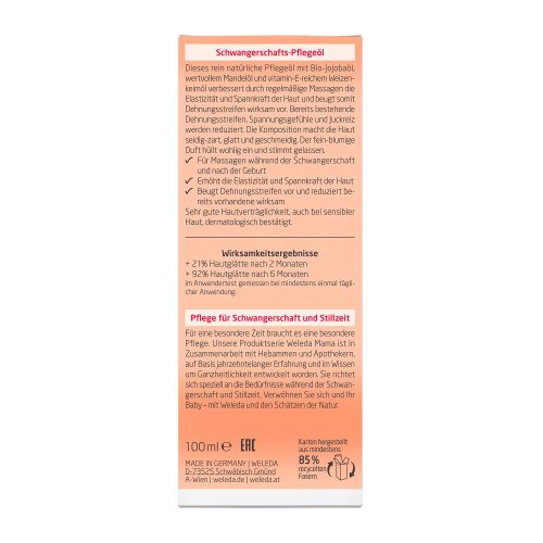 Das zu 100% natürliche Weleda Schwangerschafts-Pflegeöl verbessert durch regelmäßiges Einmassieren auf natürliche Weise die Elastizität der Haut und hilft so, Dehnungsstreifen vorzubeugen. Lassen Sie Ihrem wachsenden Bauch ganz einfach die nötige Pflege zukommen: Pflegen Sie Ihre Haut vom ersten Tag der Schwangerschaft und halten Sie sie geschmeidig. Das gemeinsam mit Hebammen entwickelte Weleda Schwangerschafts-Pflegeöl enthält wertvolles Mandel- und Bio-Jojobaöl, Vitamin-E-reiches Weizenkeimöl und einen Extrakt aus Arnikablüten. Der zarte blumige Duft von Rose, Neroli und Myrrhe stimmt Sie zuversichtlich und gelassen.