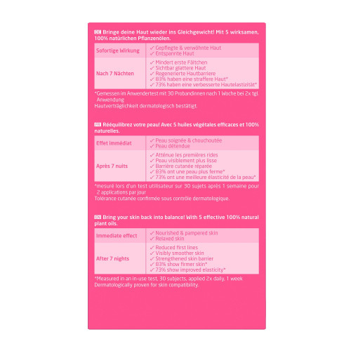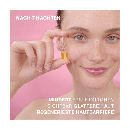 Abends nach der Reinigung anwenden. Die Glasampulle oben mit einem Kosmetiktissue umfassen und aufbrechen. Das Öl in die Hand geben und sanft in die Haut von Gesicht, Hals und Dekolleté einmassieren.