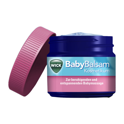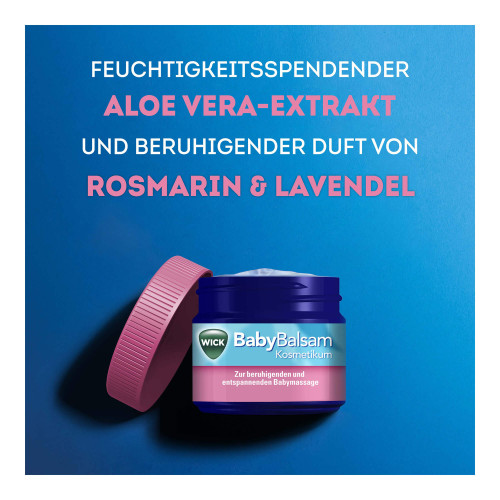 Wick Baby Balsam ist ein Kosmetikum, das Feuchtigkeit spendet und gemeinsam mit liebevollen Berührungen für eine entspannende Babymassage ab 6 Monaten genutzt werden kann. Wick Baby Balsam enthält feuchtigkeitsspendenden Aloe Vera-Extrakt und den beruhigenden Duft von Rosmarin und Lavendel.