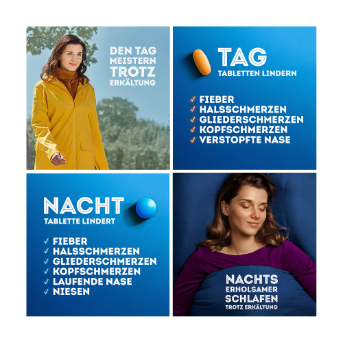 - „Tagtablette“: Die gelben Tabletten enthalten Paracetamol und Pseudoephedrin – für die Anwendung am Tag.