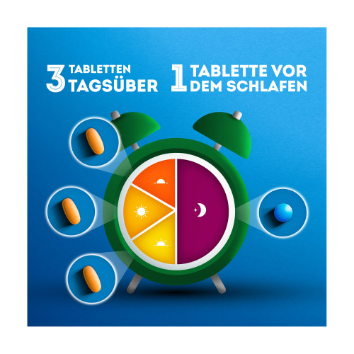 - „Nachttablette“: Die blauen Tabletten enthalten Paracetamol und Diphenhydramin – für die Anwendung in der Nacht.