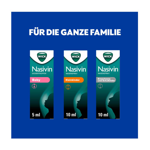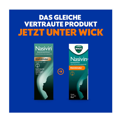 WICK Nasivin Nasenspray ohne Konservierungsstoffe Kleinkinder (0,25 mg/ml). Wirkstoff: Oxymetazolinhydrochlorid. Anwendungsgebiete: Akuter und allergischer Schnupfen, anfallsweise auftretender Fließschnupfen. Zur Erleichterung des Sekretabflusses bei Entzündungen der Nasennebenhöhlen sowie bei Tubenmittelohrkatarrh in Verbindung mit Schnupfen. Zur diagnostischen Schleimhautabschwellung.