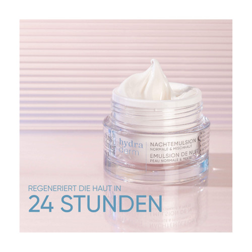 Die hydraderm Nachtemulsion wird als Nachtpflege für normale und Mischhaut verwendet. Nach gründlicher Reinigung der Haut auf Gesicht und Hals auftragen. Diese leichte Creme dringt sofort ein und hinterlässt keinen Fettfilm. Bei Mischhaut auf den fetten Stellen unter Umständen keine oder nur sehr wenig von der Nachtemulsion verwenden.