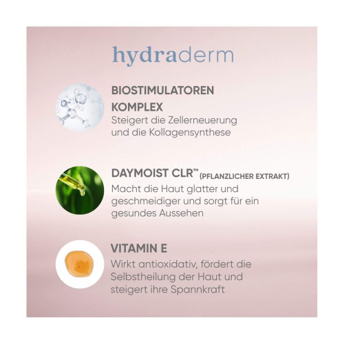 - Biostimulatoren, Hyaluronsäure und DayMoist CLR™ ersetzen in der Hornschicht die natürlichen Feuchthaltesubstanzen. Die Haut wird langanhaltend befeuchtet.