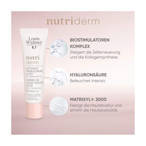 Die nutriderm Getönte Tagescreme UV 20 wird morgens auf die gründlich gereinigte Haut aufgetragen. Als wirksame Ergänzung der Gesichtspflege kann vorgängig das proderm Serum Extrait Liposomal (PZN 18442230) als Basis-Tiefenkonzentrat angewendet werden. Die Augenpartie soll ausgespart werden. Tönung nach Hauttyp und nach Jahreszeit.