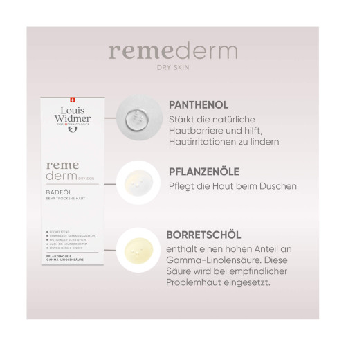 - Das remederm Ölbad ist ein emulgierender Badezusatz. Die Öle werden im Badewasser homogen verteilt. Die hochwertigen Fettstoffe werden der Haut somit über das Badewasser angeboten.