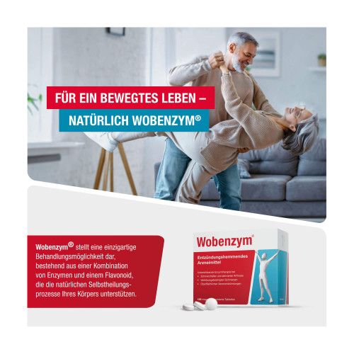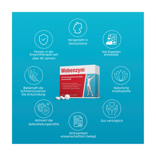 Wobenzym® magensaftresistente Tablette. Anwendungsgebiete: Zur unterstützenden Behandlung von Erwachsenen bei Schwellungen, Entzündungen oder Schmerzen als Folge von Verletzungen, oberflächlicher Venenentzündung, Entzündung des Harn- und Geschlechtstrakts; schmerzhafter und aktivierter Arthrose und Weichteilrheumatismus (Erkrankungsbild mit Beschwerden im Bereich von Muskeln, Sehnen, Bändern). Warnhinweis: Enthält Laktose.