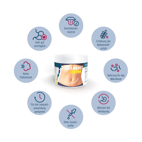 Der Ballaststoff in ZELLAMARE® DARM (resistentes Dextrin) wird aus natürlichem Mais durch ein patentiertes Verfahren ohne Gentechnik hergestellt. Lösliche Ballaststoffe binden im Darm Wasser und regen durch die damit verbundene Volumenzunahme dessen physiologische Eigenbewegungen („Peristaltik“) an. Im Dickdarm setzen dort lebende Bakterien die pflanzlichen Fasern zu Stoffwechselprodukten (kurzkettigen Fettsäuren) um, die günstige Effekte auf das gesamte Mikrobiom, die Darmschleimhaut und die Stuhlkonsistenz ausüben. Die vielfältige Wirkung von wertvollen Ballaststoffen wie resistentem Dextrin steht im Zentrum der aktuellen Gesundheitsforschung zum Mikrobiom.